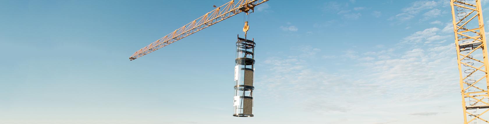 Die Anwendung von Glas im Aufzugbau ist im Grenzbereich eine Wissenschaft: Wir führen sämtliche Pendelschlagversuche (siehe Trailer) in unserer eigenen Fertigung durch, arbeiten dabei, wo erforderlich, mit den einschlägigen Hochschulen zusammen und testen die Grenzen des Machbaren.